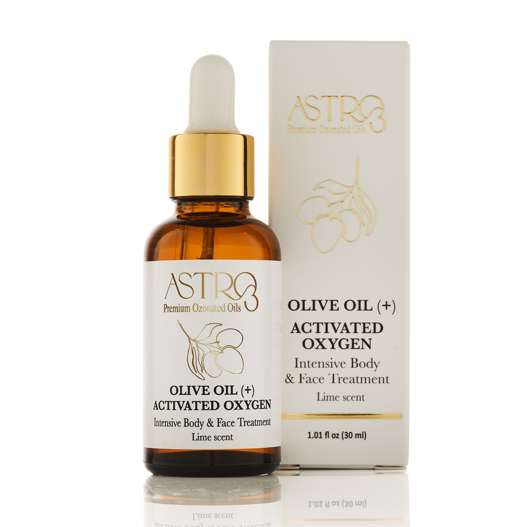 שמן AstrO³ לפנים ולגוף מבוסס על שמן זית טהור אשר עבר תהליך העשרה ייחודי בחמצן פעיל (אוזון).